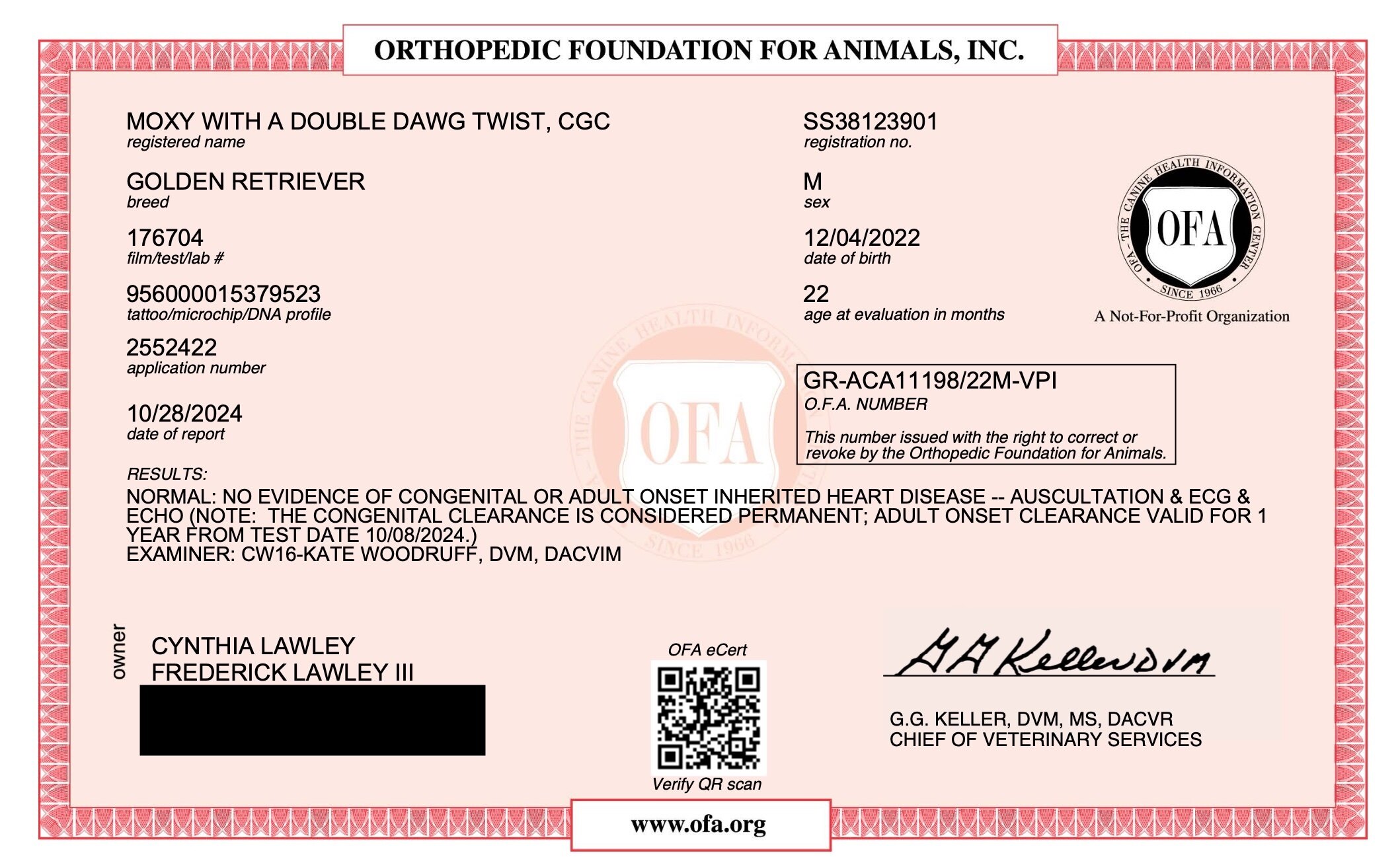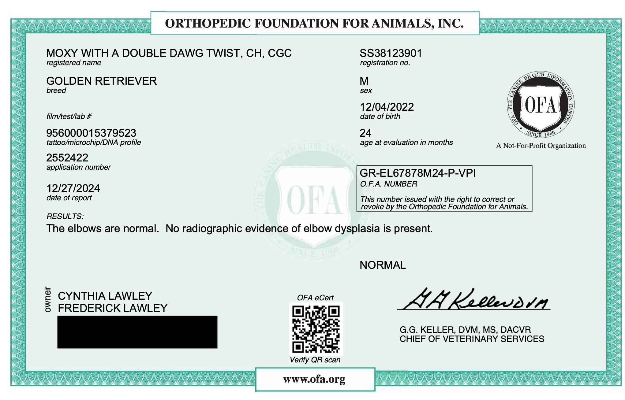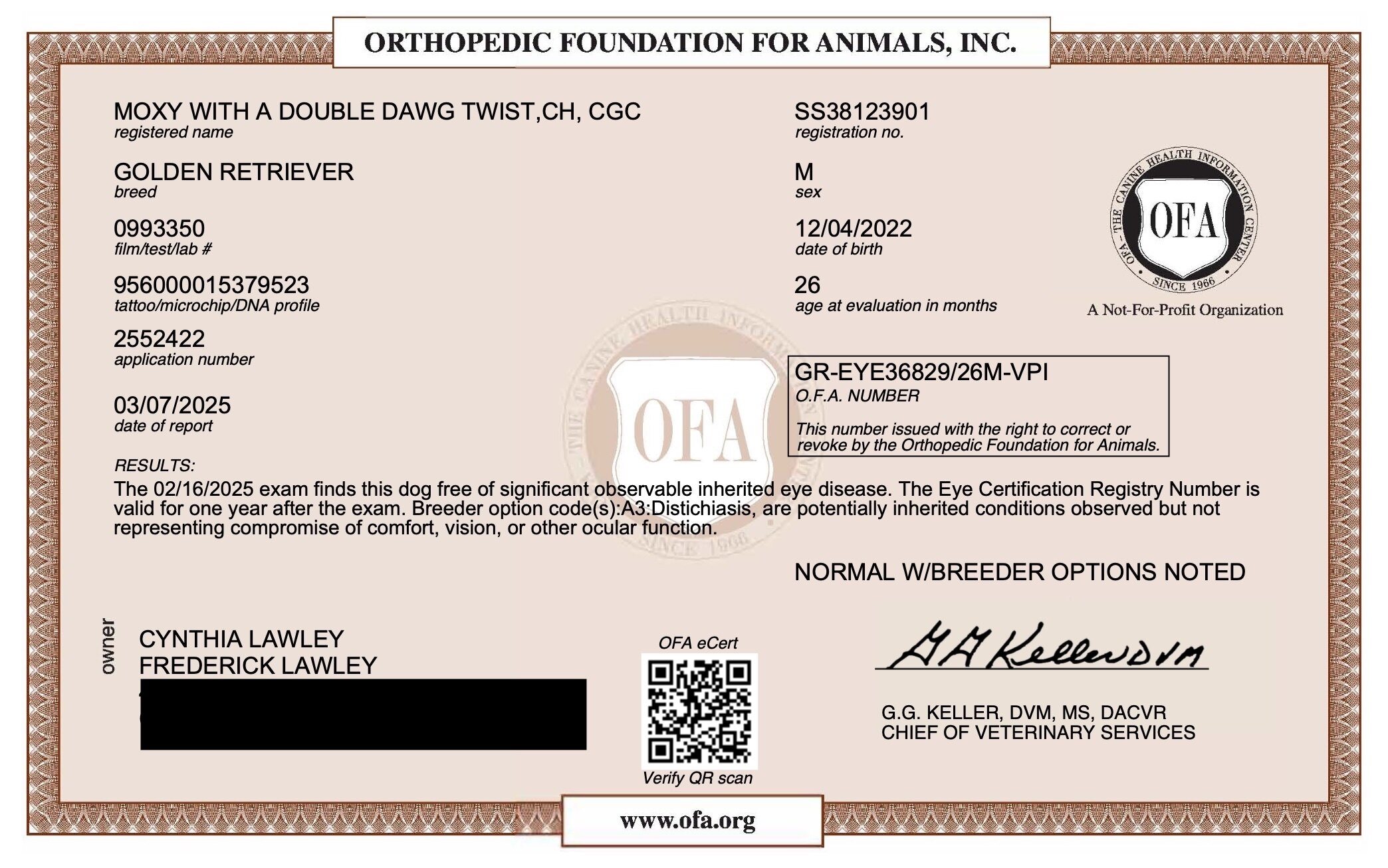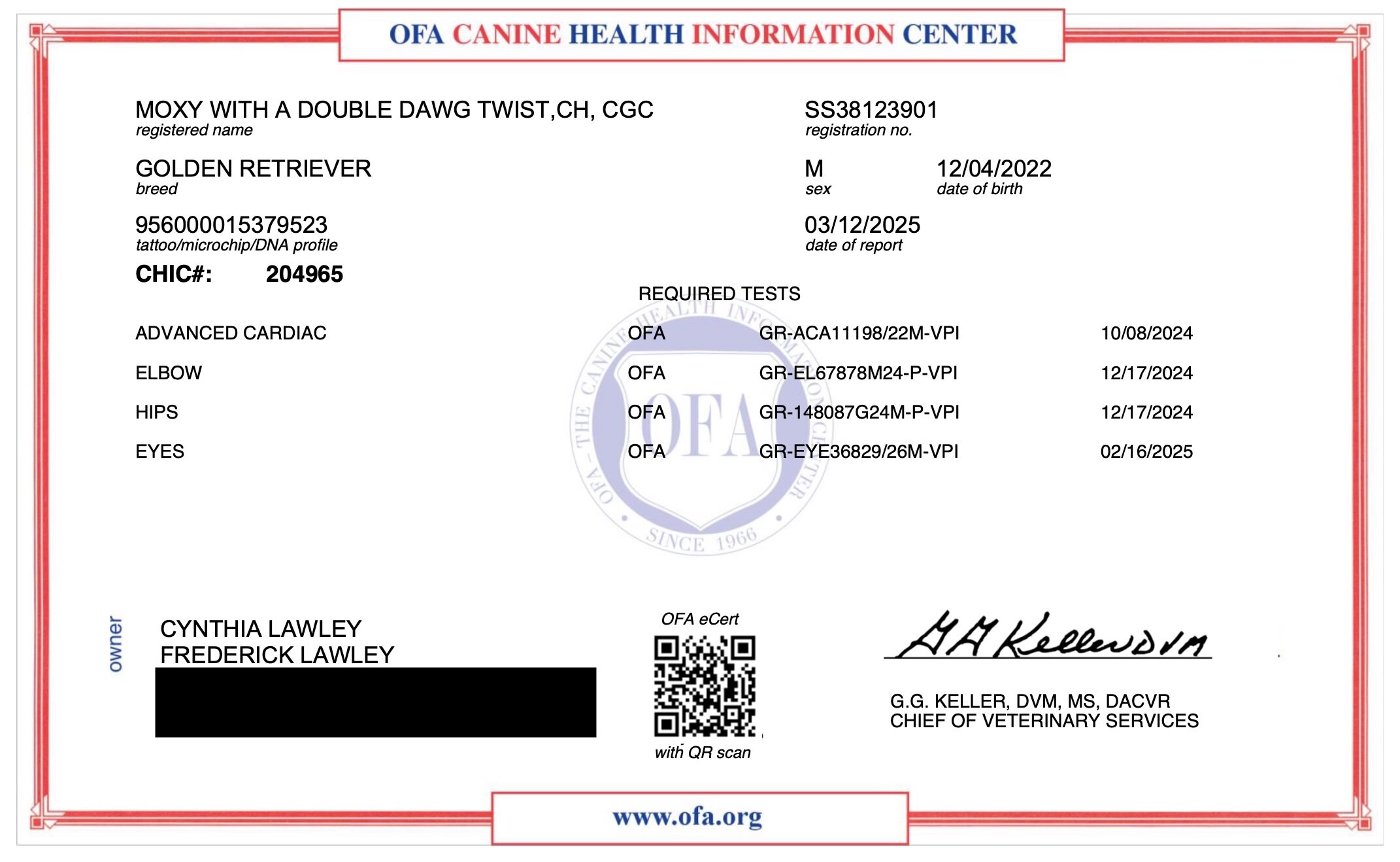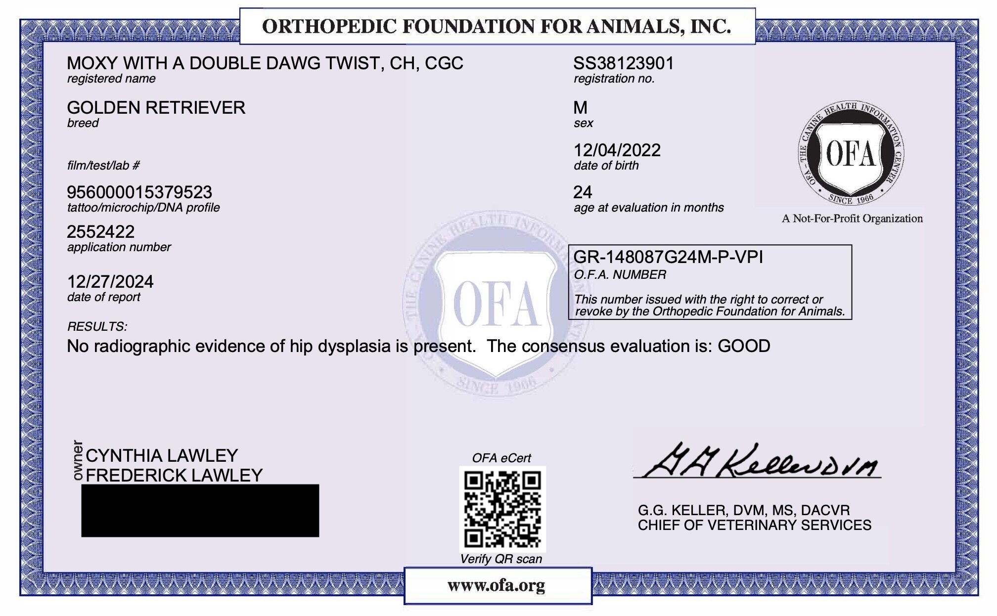 - Dam: Scotts24k Moxy Lilly of the Valley (Moxy)